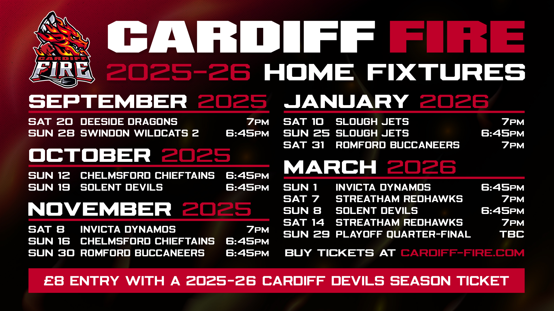 Cardiff Fire are delighted to share the fixture schedule for our return to the NIHL1 South for the upcoming 2025-26 season.